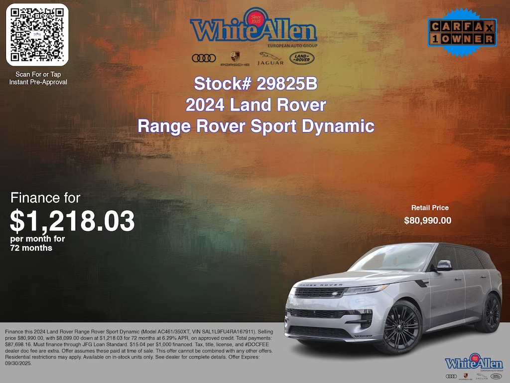 Disclaimer: Finance this 2024 Land Rover Range Rover Sport Dynamic (Model AC461/350XT, VIN SAL1L9FU4RA167911). Selling price $80,990.00, with $8,099.00 down at $1,218.03 for 72 months at 6.29% APR, on approved credit. Total payments: $87,698.16. Must finance through JFG Loan Standard. $15.04 per $1,000 financed. Tax, title, license, and #DOCFEE dealer doc fee are extra. Offer assumes these paid at time of sale. This offer cannot be combined with any other offers. Residential restrictions may apply. Available on in-stock units only. See dealer for complete details. Offer Expires: 09/30/2025.
